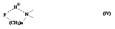 Отклонения точек для аминов, содержащих электроотрицательные заместители, также, по-видимому, следует связывать с увеличением DGB этих аминов за счет стабилизации их катионов при образовании внутримолекулярных водородных связей, например типа IV для фторсодержащих алкиламинов. Труднее объяснить наблюдаемые отклонения от соответствующих прямых точек для циклогексиламина (№1 4), гидразина (№ 15), манксина (№ 66) и N,N-диметилгидразина (№ 67). Здесь, по-видимому, проявляется как некоторое расхождение в величинах GB, полученных разными авторами (например, в случае манксина приведенное в табл. 1 значение DGB было рассчитано при сопоставлении данных по РА этого амина и GB других аминов), так и влияние (в гидразинах) неподеленной электронной пары на α-гетероатоме (α-эффект ). При