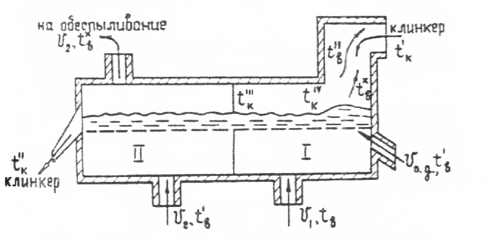 Рис. Распределение потоков воздуха и клинкера в колосниковом холодильнике I – горячая камера холодильника; II – холодная камера В начале горячей камеры устанавливают зону острого дутья для обеспечения равномерного распределения клинкера по ширине колосниковой решетки. Расход воздуха на острое дутье принимают 15% от вторичного воздуха. Расчет зоны острого дутья сводится к определению температуры подогрева воздуха острого дутья в следующей последовательности: 1. Определяем расход воздуха на острое дутье: Vод = 0,15 * Lвт * б м3/кг кл. Vод = 0,15 * 10,08 * 0,158 = 0,239 м3/кг кл. 2. Рассчитаем количество тепла, отдаваемое клинкером при охлаждении в этой зоне: Qk’ = ik’ – ikiv кДж/кг кл. где ikiv – энтальпия клинкера при температуре в конце зоны острого дутья tkiv = 1000 oC, кДж/кг кл. Qk’ = 1114,3 – 1000,5 = 113,8 кДж/кг кл. 3. Температура воздуха острого дутья при входе в печь находим из уравнения теплового баланса зоны по полученной энтальпии. Потерями в окружающую среду на этом участке пренебрегают: iвx = Qk’ / Vод + iв' кДж/м3 где iв’ – начальная энтальпия воздуха iвx = 113,8 / 0,239 + 13,02 = 489,17 кДж/м3 tвх = 300 + ((489,17-397,3)/(535,9-397,3)*100 = 366 oC 4. Расчет горячей камеры холодильника ведем исходя из определенного аэродинамического сопротивления слоя клинкера на решетке колосникового холодильника, которое не должно превышать 2 кПа. Уравнение аэродинамического сопротивления слоя сыпучего материала имеет следующий вид: Р = ( * Н * в2 * в) / d Па где в – плотность воздуха в камере при средней действительной температуре, кг/м3 - коэффициент аэродинамического сопротивления материала, для горячей камеры по опытным данным принимаем 0,043 Н - высота слоя гранул клинкера на решетке, равная 0,15-0,2 м d – средний диаметр зерен клинкера, может быть принят равным 0,01 м в – скорость воздух Р может быть принята, исходя из опытных данных, равной 1000 Па Средняя температура воздуха в камере: tвср = (tв’ + tвх) / 2 oC где tв’ – температура окружающего воздуха tвх – принимаем предварительно равной температуре воздуха, нагретого в зоне острого дутья tвср = (10 + 366) / 2 = 188 oC Определим плотность воздуха в камере при tвср: в = * (273 / (273 + tвср)) = * (273 / (273 + 188)) = 0,766 кг/м3 Определяем скорость воздуха: в = ((Р * d) / ( * Н * в ))0,5 м3/м2с в = ((1000 * 0,01) / (0,043 * 0,2 * ))0,5 = 1,23 м3/м2с Далее рассчитываем площадь решетки горячей камеры: F1 = ((Lвт*б - Vод)*П*(1+*t) / (3600*в) м2 F1 = ((10,08*0,158 – 0,239)*75000*(1+188/273) / (3600*1,23) = 38,7 м2 Для холодильников «Волга» ширина решетки зависит от производительности печи и при П=75 т/ч равна а=4,2 м. Тогда длина составит: L1 = F1 / а = 38,7 / 4,2 = 9,2 м 5. Время пребывания клинкера в горячей камере определяют по скорости его движения: к = П / (к * а * Н) м/ч где к – насыпная плотность клинкера, к=1550 кг/м3 к = 75000 / (1550 * 4,2 * 0,2) = 57,6 м/ч Отсюда находим время пребывания клинкера в камере: 1 = L1 / к = 9,2 / 57,6 = 0,16 ч (10 мин.) 6. Температуру клинкера в конце горячей камеры ( tk‘‘‘ ) определяем из уравнения степени охлаждения клинкера: 0 = в / (1+*t) = 1,23/(1+188/273) = 0,73 м/ч (tk‘‘‘-tв’) / (tkiv- tв’) = 1 / exp( К * 00,7 * 1 + А) где К и А – коэффициенты, зависящие от средней теплоемкости клинкера, для горячей камеры принимают соответственно 9,0 и 0,79 (tk‘‘‘- 10) / (1000 - 10) = 1 / exp( 9 * 0,730,7 * 0,16 + 0,79) tk‘‘‘ = 152 oC ik‘‘‘ = 78,7 + (165,8-78,7) * ((152-100) / (200-100)) = 124 кДж/кг кл. 7. Температуру воздуха, поступающего из горячей камеры холодильника в печь, находим из уравнения теплового баланса камеры, составленного на 1кг клинкера: ikiv – ik‘‘‘ =( Lвт * б - Vод)*( iв’’ – iв’ ) + qп’ где iв’’ - энтальпия возд