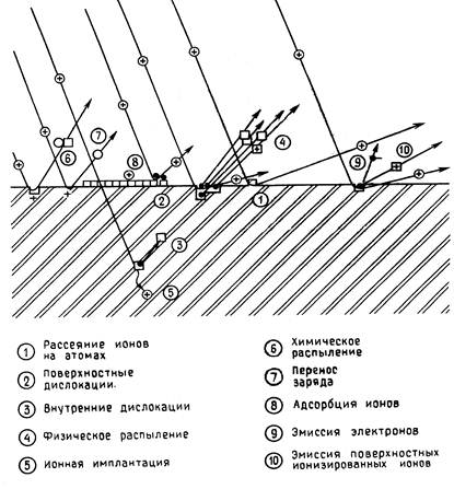 Реферат: Вторично-ионная масса спектрометрияРеферат: Вторично-ионная масса спектрометрияКалужский Филиал Московского Государственного Технического Университета им. Н. Э. Баумана Кафедра Материаловедения и Материалов Электронной Техники КУРСОВАЯ РАБОТА по курсу МИМ и КЭТ на тему: “Вторично-ионная масс-спектрометрия“ выполнил: студент гр. ФТМ—81 Тимофеев А. Ю. проверил: Леднева Ф. И. г. Калуга 1997 год. Содержание Введение 3 Взаимодействие ионов с веществом 3 Вторично-ионная эмиссия 5 Оборудование ВИМС. 8 Принцип действия установок. 9 Установки, не обеспечивающие анализа распределения частиц по поверхности 10 Установки, позволяющие получать сведения о распределении 11 элемента по поверхности, со сканирующим ионным зондом Установки с прямым изображением 11 Порог чувствительности 12 Анализ следов элементов 14 Ионное изображение 16 Требования к первичному ионному пучку 17 Масс-спектрометрический анализ нейтральных 18 распыленных частиц Количественный анализ 19 Глубинные профили концентрации элементов 22 Приборные факторы, влияющие на разрешение 23 по глубине при измерении профилей концентрации Влияние ионно-матричных эффектов на разрешение 25 по глубине при измерении профилей концентрации Применения 26 Исследование поверхности 26 Глубинные профили концентрации 27 Распределение частиц по поверхности, 27 микроанализ и объемный анализ Заключение 27 Список литературы 29 Возможности получения сведений о составе внешнего атомного слоя твердого тела значительно расширялись всвязи с разработкой и усовершенствованием метода вторично-ионной масс-спектрометрии (ВИМС) и других методов. Большинство таких методов близки к тому, чтобы анализировать саму поверхность, поскольку основная информация о составе материала поступает из его приповерхностной области толщиной порядка 10А, а чувствительность всех таких методов достаточна для обнаружения малых долей моноатомного слоя большинства элементов. Взаимодействие быстрых ионов с твердым телом приводит к выбиванию атомов и молекул материала как в нейтральном, так и в заряженном состоянии. На таком явлении сравнительного эффективного образования заряженных частиц (вторичных ионов) и на принципе высокочувствительных масс-спектрометрических измерениях и основан метод ВИМС. Хотя у него, как у любого другого метода, имеются свои недостатки, только он один дает столь широкие возможности исследования и поверхности, и объема твердого тела в одном приборе. Наиболее важными характерными особенностями метода, которые вызывают повышенный интерес к нему, являются очень низкий порог чувствительности для большинства элементов (меньше 10-4 моноатомного слоя), измерение профилей концентрации малых количеств примесей с разрешение по глубине меньше 50А, разрешение по поверхности порядка микрометра, возможность изотопического анализа и обнаружение элементов с малыми атомными номерами (H, Li, Be и т. д.) Взаимодействие ионов с веществом Фиг.1. Виды взаимодействий ионов с твердым телом [2]. В этом разделе рассматривается поведение ионов высоких энергий (1 - 100 кэВ), попадающих на поверхность твердого тела. Фиг.1 иллюстрирует 10 разновидностей взаимодействия ионов с поверхностью [2]. Падающий ион может обратно рассеиваться атомом или группой атомов бомбардируемого образца (1). Процесс обратного рассеяния обычно приво