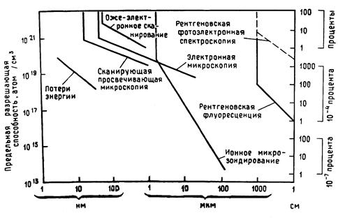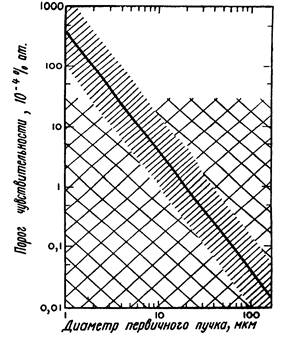 Самое важное значение в вопросе о возможностях ВИМС как метода анализа поверхностей имеет взаимосвязь между параметрами пучка первичных ионов, скоростью распыления поверхности и порогом чувствительности для элементов. Из-за отсутствия информации о такой взаимосвязи часто возникают неправильные представления о возможностях метода. Соотношения между током первичных ионов, диаметром и плотностью пучка, скоростью распыления поверхности и порогом чувствительности при типичных условиях иллюстрируются графиком, представленным на фиг.5. Скорость удаления (число монослоев в секунду) атомов мишени при заданной энергии ионов пропорциональна плотности их тока DP, а порог чувствительности при регистрации методом ВИМС (минимальное количество элемента, которое можно обнаружить в отсутствие перекрывания пиков масс-спектра) обратно пропорционален полному току ионов IP. Коэффициент пропорциональности между порогом чувствительности ВИМС и IP определяется исходя из результатов измерений для ряда элементов в различных матрицах путем приближенной оценки, основанной на экспериментальных значениях для типичных пар элемент - матрица. При построении графика на фиг.5 предполагалось, что площадь захвата анализатора, из которой вторичные ионы отбираются в анализатор, не меньше сечения пучка первичных ионов. Данное условие обычно выполняется в масс-спектрометрии, если диаметр области, из которой поступают ионы, не превышает 1 мм. Фиг. Зависимость между током первичных ионов, диаметром и плотностью первичного пучка, скоростью удаления атомных слоев и порогом чувствительности ВИМС[1]. Распыление ионным пучком - разрушающий процесс. Но если требуется, чтобы поверхность оставалась практически без изменения, то анализ методом ВИМС можно проводить при очень малых скоростях распыления образца (менее 10-4 монослоя в секунду) . Чтобы при этом обеспечить достаточную чувствительность метода ( »10-4 монослоя), как видно из фиг.5, необходим первичный ионный пучок с током 10-10 А диаметром 1 мм. При столь низкой плотности тока первичных ионов ( 10-5 мА/см2) скорость поступления на поверхность образца атомов или молекул остаточных газов может превысить скорость их распыления первичным пучком. Поэтому измерения методом ВИМС в таких условиях следует проводить в сверхвысоком или чистом (криогенном) вакууме. Указанные приборные условия приемлемы не во всех случаях анализа. Например, определение профиля концентрации примесей, присутствующих в малых количествах в поверхностной пленке толщиной свыше 5ОО А, удобно проводить при диаметре пучка, равном 100 мкм, и при скорости распыления, превышающей 10-1 атомных слоев в секунду. Еще более высокие плотности ионного тока требуются, чтобы обеспечить статистически значимые количества вторичных ионов с единицы площади поверхности, необходимые при исследовании распределения по поверхности следов элементов при помощи ионного микрозонда или масс-спектрального микроскопа. На основании сказанного и данных фиг.5 мы заключаем, что невозможно обеспечить поверхностное разрешение в несколько микрометров для примеси, содержание которой равно »10-4%, при скорости распыления менее 10-3 атомных слоев в секунду. Это взаимно исключающие условия. Методом ВИМС анализ поверхности можно проводить в двух разных режимах: при малой и большой п