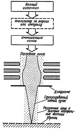 Фиг.11. Компоненты сфокусированного ионного пучка, связанные с рассеянными ионами и нейтральными атомами[1]. Чтобы предупредить внедрение в образец того элемента, содержание которого определяется, особенно важна химическая чистота первичного ионного пучка. При типичных условиях (скорость распыления образца, пробел и разброс по пробегам первичных ионов) и в предположении, что распыление продолжается достаточно, долго, для того чтобы воздействовать на уже легированную зону, а основным источником ионов примеси является обратное распыление ранее внедренных частиц, присутствие в первичном ионном пучке 10-6 загрязнений должно проявиться как объемная примесь с атомной концентрацией ~10-7. Чтобы гарантировать чистоту первичного ионного пучка и исключить возможность осложнений на уровне следов элементов, желательно осуществлять сепарацию пучка первичных ионов по массе. Чтобы уменьшить влияние загрязнения поверхности остаточными газами, при анализе объемного состава твердого тела обычно пользуются первичными ионными пучками с высокой плотностью тока. При этом область малой плотности тока, т.е. периферийная часть пучка, дает основной вклад во вторично-ионный сигнал того элемента, который присутствует одновременно как в остаточном газе, так и в твердом теле в виде микропримеси. К подобному эффекту может привести не только загрязнение атомами остаточных газов (обычно наиболее существенное), но и любые иные источники поверхностных загрязнений, действующие во время измерений. Для установок ВИМС, основанных на обычной методике масс-спектрометрии, указанная проблема более важна, чем для масс-спектральных микроскопов. В последнем случае можно в плоскости изображения поместить вырезающую диафрагму так, чтобы отбирать лишь ионы, выходящие из средней, эффективно распыляемой части мишени, где равновесная поверхностная концентрация адсорбированных загрязнений минимальна. Другой эффект, в известной мере аналогичный рассмотренному выше эффекту периферийной области пучка, поясняется схемой, представленной на фиг.11. Он связан с облучением большой площади образца быстрыми нейтральными атомами, образующимися в результате перезарядке при столкновениях первичных ионов с атомами, а также рассеянными ионами, возникающими при фокусировке первичного ионного пучка на мишень. Размер облучаемой этими частицами области определяется ограничивающими диафрагмами на пути ионного пучка и обычно превышает 250 мкм. Роль этого эффекта зависит от давления остаточных газов, конструкции линз, расположения и размеров диафрагм и геометрического устройства электродов колонны. Такая несфокусированная часть облучающего мишень потока непосредственно не зависит от сфокусированного ионного тока, поступающего на образец, но в основной своей части определяется полным потоком ионов в колонне. В микрозондовом варианте метода ВИМС эти эффекты гораздо более серьезны, нежели в масс-спектральных микроскопах. Но к существенным ошибкам при анализе с применением микрозонда они приводят только в том случае, когда большая площадь, облучаемая несфокусированной частью пучка, замет но отличается по составу от анализируемой точки. При диаметре пучка, равном нескольким микрометрам, несфокусированный компонент может облучать большую площадь поверхности образца 