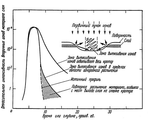 Приборные факторы, влияющие на разрешение по глубине при измерении профилей концентрации Получить при методе ВИМС надежные сведения о глубинном профиле можно лишь в том случае, если поддерживается постоянная интенсивность тока первичных ионов и обеспечивается однородность плотности тока пучка в той части поверхности, из которой в масс-анализатор отбираются вторичные частицы. В стационарном сфокусированном ионном пучке плотность тока, падающего на образец, не постоянна по сечению пучка, а следовательно, и распыление поверхности в этих условиях не может быть равномерным. Если зона, из которой поступает информация, охватывает все сечение первичного пучка, то вклад в сигнал ионов с краев кратера будет искажать профиль концентрации элемента в приповерхностном слое (фиг. 13). Ошибки такого рода устраняются в ВИМС разными способами в зависимости от конструкции прибора. В устройствах, в которых не предусмотрена возможность определять распределение элемента по поверхности, обычно расфокусируют пучок так, чтобы его сечение было больше анализируемой области или вырезают при помощи диафрагмы из расфокусированного пучка определенный участок с однородной плотностью тока. Иногда на поверхности мишени помещают тонкую маску из материала, не дающего вторичных ионов, близких к анализируемым, которая ограничивает вторичную ионную эмиссию из областей неоднородной плотности первичного пучка. Фиг.13. Переменный профиль концентрации в приповерхностном слое с указанием различных приборных факторов, которые приводят к искажению профиля по сравнению с истинным распределением[1]. Наиболее удовлетворительный способ решения проблемы - электрически развертывать сфокусированный ионный пучок в растр по достаточно большой площади поверхности мишени так, чтобы обеспечить в ее нейтральной части однородную плотность тока. При этом нужно уделить особое внимание системе развертки пучка: напряжение строчной и кадровой развертки должно изменяться линейно со временем, обратный ход пучка должен бланкироваться или хаотизироваться, а скорость развертки должна быть согласована с размерами пучка, чтобы соседние строки растра перекрывались. Чтобы полностью использовать достоинства этого метода, необходимо ограничить зону отбора вторичных ионов областью однородной плотности пучка. Осуществить это сравнительно просто в установках ВИМС, которые позволяют получать сведения о распределении вещества по поверхности. В сканирующей микрозондовой установке, где первичный ионный пучок малого диаметра разворачивается в растр по поверхности, можно работать в режиме, в котором система детектирования регистрирует вторичные ионы лишь при прохождении лучом выделенного “окна”. Даже тогда, когда зона, из которой собирается информация, ограничена областью однородной плотности тока, имеется еще ряд приборных эффектов, приводящих к искажению формы профилей концентрации. К примеру, эффект обратного осаждения на мишень ранее распыленного вещества: материал, распыленный с краев кратера, оседает на его дне (в том числе на поверхности анализируемой зоны) и затем вновь распыляется (фиг. 13). Такой эффект обычно существенен лишь при измерении “хвостов” профилей с малой концентрацией и сильно ослабляется, если увеличить крутизну стенок кратера. К аналогичным и