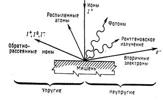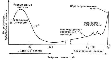 Фиг.3. Схематическое представление взаимодействия ионов с мишенью [2]. Неупругие взаимодействия с электронами мишени вызывают вторичную электронную эмиссию, характеристическое рентгеновское излучение и испускание световых квантов. Упругие взаимодействия приводят к смещению атомов кристаллической решетки, появлению дефектов и поверхностному распылению. Эти процессы схематически проиллюстрированы на фиг. 3. Энергетический спектр рассеянных твердотельной мишенью ионов с начальной энергией Е0 схематически представлен на фиг.4. Здесь видны широкий низкоэнергетический (10 - 30 эВ) горб, соответствующий испусканию нейтральных атомов (распыленные атомы), и высокоэнергетический горб, расположенный вблизи энергии первичного иона Е0 (упругорассеянные ионы). Вторично-ионная эмиссия Основные физические и приборные параметры, характеризующие метод ВИМС, охватываются формулами (1) - (3). Коэффициент вторичной ионной эмиссии SА±, т. е. число (положительных или отрицательных) ионов на один падающий ион, для элемента А в матрице образца дается выражением SА±=gА±САS, (1) где gА± - отношение числа вторичных ионов (положительных или отрицательных) элемента А к полному числу нейтральных и заряженных распыленных частиц данного элемента, а СА -атомная концентрация данного элемента в образце. Множитель S - полный коэффициент распыления материала (число атомов на один первичный ион). В него входят все частицы, покидающие поверхность, как нейтральные, так и ионы. Величины gА± и S сильно зависят от состава матрицы образца, поскольку отношение gА± связано с электронными свойствами поверхности, а S в большой степени определяется элементарными энергиями связи или теплотой атомизации твердого тела. Любой теоретический способ пересчета измеренного выхода вторичных ионов в атомные концентрации должен, давать абсолютное значение отношения gА± или набор его приведенных значений для любой матрицы. Фиг.4. Энергетический спектр электронов, рассеянных при соударении с твердотельной мишенью [2]. Вторичный ионный ток iА± (число ионов в секунду), измеряемый в приборе ВИМС, дается выражением iА± =hASA±IP, (2) где iА± - ионный ток для моноизотопного элемента (для данного компонента многоизотопного элемента ионный ток равен faiА±, где fa,- содержание изотопа а в элементе А). Величина hA -эффективность регистрации ионов данного изотопа в используемом приборе ВИМС. Она равна произведению эффективности переноса ионов через масс-анализатор на чувствительность ионного детектора. Множитель hA обычно можно рассматривать как константу, не зависящую от вида элемента или массы изотопа, если энергетические распределения вторичных ионов примерно одинаковы и имеют максимум при нескольких электрон-вольтах, так что зависящее от массы изменение чувствительности детектора частиц мало. Наконец, IP полный ток первичных ионов (число ионов в секунду), падающих на образец. Конечно, величина IP связана с плотностью тока первичных ионов DP (число ионов за секунду на 1 см2) и диаметром пучка d (см). Если для простоты принять, что сечение пучка круглое, а плотность DP тока постоянна в пределах сечения, то IP=(0,25p)DPd2. (3) При существующих источниках первичных ионов, используемых в приборах ВИМС, плотность тока на образец, как правило, не превышает 100 мА/см2 (в случае однозарядных ионов ток 1 mА соответствует потоку 6.2 101