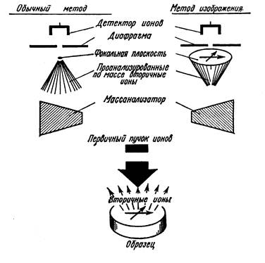 Фиг.6. Схема обычного метода и метода прямого изображения при масс- спектрометрическом анализе вторичных ионов[1]. При масс-анализе вторичных ионов применяются два основных метода: обычный масс-спектрометрический и метод прямого изображения. Они схематически сопоставлены на фиг.6. При первом методе анализатор с хорошим разрешением передает на высокочувствительный ионный детектор заметную часть быстрых вторичных ионов, идущих с большой площади образца (» 1 мм2). Выделенные по массе вторичные частицы собираются в точечный фокус на входной щели детектора. В этом статическом случае получаемая информация усредняется по поверхности образца и невозможно установить, из какой точки (например области диаметром 1 мкм) поверхности приходят вторичные ионы. При методе прямого изображения в фокальной плоскости анализатора создается стигматическое ионное изображение поверхности и путем соответствующего дифрагмирования (или преобразования изображения при помощи чувствительной к электронам или ионам эмульсии) легко можно получить информацию о точках выхода ионов с данными m/e с поверхности образца. Все установки с прямым изображением основан на идее прибора Кастэна и Слодзяна; все иные приборы представляют собой варианты обычной масс-спектрометрической методики. Для получения вторично-ионного изображения поверхности при обычном подходе необходимо проводить последовательный анализ вторичных частиц при сканировании поверхности мишени первичным ионным пучком малого диаметра. При этом для получения изображения мишени на экране электронно-лучевой трубки (ЭЛТ) проще электрически сканировать первичный пучок, нежели механически перемещать сам образец. Электронный луч в ЭЛТ синхронизирован с первичным ионным пучком, и усиленным сигналом вторично-ионного детектора модулируются интенсивность электронного луча в ЭЛТ. Получаемое при таком методе увеличение изображения равно отношению длины строки на экране ЭЛТ к расстоянию на поверхности образца, пробегаемому первичным ионным пучком в процессе сканирования. Все установки ВИМС позволяют осуществлять анализ поверхности и распределения концентрации элемента по глубине. Они различаются в таких важных отношениях, как порог чувствительности при детектировании, разрешение по массам, плотности тока первичного пучка, вакуумные условия в окрестности мишени, а также возможность проведения анализа распределения элементов по поверхности, или топографического (x-y) анализа, путем сканирования зондом или формирования изображения. К устройствам для топографического анализа относят лишь те, которые позволяют получить разрешение по поверхности не хуже 10 мкм. Все существующие установки ВИМС можно разделить на три группы в соответствии с принципом их устройства и пригодностью для микроанализа: · не позволяющие осуществлять анализ распределения элементов по поверхности; · дающие сведения о распределении по поверхности с помощью сканирующего ионного зонда; · дающие сведения о распределении по поверхности методом прямого изображения. Установки, не обеспечивающие анализа распределения частиц по поверхности Ряд вторично-ионных масс-спектрометров был сконструирован для решения частных аналитических проблем или исследования различных закономерностей вторичной ионной эмиссии. Использ