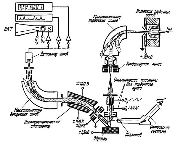 Фиг.7. Схема ионного микрозонда[4]. Установки с прямым изображением Первой установкой ВИМС, которая позволила получить изображение объекта в лучах выделенных по m/е ионов и визуально наблюдать распределение элемента по поверхности, был масс-спектральный микроскоп, его схема представлена на фиг.8. Уникальная особенность масс-спектрального микроскопа - возможность наблюдать за интенсивностью вторичных ионов со специально выделенного микроучастка поверхности независимо от размеров и местоположения первичного пучка, пока хотя бы часть его попадает на интересующий нас участок поверхности. Эта возможность является ценной в некоторых случаях анализа методом ВИМС распределения элементов по поверхности и в объеме. Ниже будут рассмотрены некоторые из наиболее важных преимуществ, а также и недостатков, свойственных различным типам приборов.