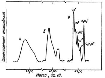 Фиг.9. Участок масс-спектра вторичных ионов флюорапатита вблизи массы 43 при разном разрешении по массам: а-300; б-1000; в-3000[1]. Перекрытие пиков от атомарных и молекулярных ионов можно выявить двумя способами: путем анализа быстрых вторичных ионов или применением анализаторов по m/е с разрешением М/DМ > 3000. В первом случае коэффициент ионной эмиссии уменьшается примерно во столько же раз, во сколько коэффициент выбивания молекулярных ионов уменьшается по сравнению с атомарными. В некоторых случаях этот метод вполне приемлем; но при решении многочисленных задач обнаружения следов примесей или микроанализа поверхности недопустимо большое снижение чувствительности характерное для этого метода. Второй способ является более прямым и с точки зрения анализа более предпочтителен. Чтобы выявить сложную структуру отдельных пиков в масс-спектрах используют для ВИМС приборы с высоким разрешением по массе. На фиг.9, представлена форма пика с массой 43 ат. ед. при разных разрешениях анализатора. Высокое разрешение очень важно для уменьшения или исключения в идентификации пиков m/е, особенно если основной целью является обнаружение следов элементов на уровне атомных концентраций, не превышающих 10-5. Вопрос о пороге чувствительности метода ВИМС для различных элементов исследовался многими авторами как теоретически, так и на основе результатов экспериментальных измерений. При этом были получены следующие примерные значения, подтвердившиеся в некоторых строго определенных условиях: менее 10-7 моноатомного слоя, атомная концентрация 10-9 и менее 10-18 г элемента. Но эти значения характерны лишь для некоторых частных случаев и не являются нормой на практике. Обычно мы имеем дело со сложными спектрами с многократными наложениями линий, в силу чего порог чувствительности оказывается сильно зависящим от природы матрицы образца. Поэтому, указывая порог чувствительности, необходимо указывать и соответствующие дополнительные факторы, в частности тип матрицы, и не следует делать огульные утверждения относительно того или иного элемента. Если пренебречь возможным перекрытием пиков, то порог чувствительности для некоторого элемента в матрице обратно пропорционален току первичных ионов IP, попадающему на образец. На фиг.5 и 10 показано, как