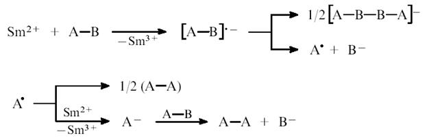 Механизм органических реакций с участием SmI2 (общий вид) Рис 3.1 Использование SmI2 способствует протеканию многих органических реакций с высокими скоростями и высоким выходом конечного продукта даже при низких температурах (-70 - 20°С), а так же позволяет провести реакции, которые не удавалось провести с помощью других восстановителей (йодметилирование карбонильных соединений, синтез больших лактонных циклов, селективное восстановление альдегидной группы в присутствии кетонной). Кроме того, самарий вводят в состав стекол, способных люминесцировать и поглощать инфракрасные лучи. Но не всегда самарий полезен. Физики считают, что из радиоактивных изотопов наибольшую опасность в качестве «реакторного яда» представляет ксенон-135, а из стабильных - изотоп самария с массовым числом 149. Сечение захвата тепловых нейтронов у самария-149 огромно - 66000 барн. Но в работающем реакторе происходит как бы самоочищение: при поглощении нейтрона самарий-149 превращается в самарий-150, который поглощает замедленные нейтроны намного хуже: 14962Sm(n, γ)Sm62150 Для реактора на быстрых нейтронах самарий-149 не опасен: быстрые нейтроны его ядрами не захватываются. Природный самарий состоит из семи изотопов (массовые числа: 144, 147, 148, 149, 150, 152 - самый распространенный изотоп - и 154). Самарий-147 α - радиоактивен, период его полураспада около 100 миллиардов лет. Но не только из-за самария-147 радиоактивен минерал самарскит. В его состав наряду с редкими землями, кислородом, железом, танталом и ниобием входит уран. ЕВРОПИЙ.В 1886 году французский химик Демарсэ выделил из самариевой земли новый элемент, который, скорее всего, был не очень чистым европием. Но повторно опыт воспроизвести не удалось. В том же году англичанин Уильям Крукс обнаружил новую линию в спектре самарскита. Демарсе потратил на выделение нового элемента из самариевой земли несколько лет, и, наконец, в 1896 году ему удалось приготовить чистый препарат. Первоначально Демарсе обозначил открытый им элемент греческой заглавной буквой Σ (сигма). А в 1901 году после серии контрольных экспериментов этот элемент получил свое нынешнее название. Металлический европий впервые был получен лишь в 1937 году. Европий - последний редкоземельный элемент подгруппы церия. Он самый легкий из лантаноидов, его плотность всего 5,245 г/см3. У европия же наибольшие из всех лантаноидов атомный радиус и атомный объем. Так же, как и его соседи по таблице Менделеева, европий входит в число наиболее сильных поглотителей тепловых нейтронов. Отсюда его возможности в атомной технике и технике защиты от излучений. В качестве материала противонейтронной защиты элемент N63 интересен тем, что после поглощении нейтронов его природные изотопы 151Eu и 153Eu не теряют способность к дальнейшему поглощению нейтронов. Радиоактивный европий, полученный из атомных реакторов, используется при лечении некоторых форм рака. Важное значение приобрел европий как активатор люминофоров. Микропримесями европия активируют, в частности, окись иттрия Y2O3 и ортованадат иттрия YVO4, используемые для получения красного цвета на телевизионных экранах. Приобрели практическое значение и другие люминофоры, активированные европием. Соединения европия (он проявляет валентности 2+ и 3+), как правило, белого цвета с розовато-оранжевым оттенком. Соединения европия с хлором и бромом светочувст