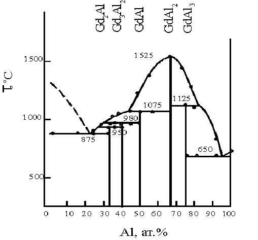 Диаграмма плавкости системы Al – Gd Рис. 2.2. Химическая активность элементов в ряду Ce–Lu несколько уменьшается из-за уменьшения их радиусов. С кислородом все лантаноиды образуют основные оксиды типа Э2O3, характеризующиеся высокими энтальпиями и энергиями Гиббса образования (∆G°f,298 ≈ -1600 кДж/моль) и являющиеся химически и термически устойчивыми; так, La2O3 плавится при температуре 2000 °С, а CeO2 – около 2500 °С. Самарий, европий и иттербий, кроме оксидов Э2O3, образуют также монооксиды EuO, SmO, YbO. Церий легко образует оксид CeO2. Оксиды лантаноидов в воде нерастворимы, но энергично взаимодействуют с ней, образуя гидроксиды: Э2О3 + 3Н2О=2Э(ОН)3 С растворами щелочей оксиды лантаноидов (III) не взаимодействуют, однако получены кристаллические соединения состава LiЭО2 и NaЭО2, что свидетельствует об амфотерности Э2О3. При прокаливании оксиды Э2О3, подобно Al2О3 теряют химическую активность. Гидриды лантаноидов образуются при взаимодействии простых веществ при нагревании (300-400°С). Все лантаноиды образуют гидриды состава ЭН2, и, за исключением Eu и Yb соединения, приближающиеся по составу к ЭH3. Особенности образования гидридов европием и иттербием, по-видимому, связаны с устойчивостью 4f7- и 4f14- конфигураций. Гидриды ЭН2 построены по типу флюорита и имеют солеобразный характер. В большей мере, ЭН2 напоминают ионные гидриды щелочно-земельных металлов, а с гидридами d-элементов имеют мало общего. Водородные соединения лантаноидов химически весьма активны и энергично взаимодействуют с кислородом, галогенами и другими сильными окислителями. Особенно реакционноспособны соединения типа ЭН3. Гидроксиды лантаноидов по силе уступают лишь гидроксидам щелочноземельных металлов. Лантаноидное сжатие приводит к уменьшению ионности связи Э–ОН и уменьшению основности в ряду Ce(OH)3 – Lu(OH)3.В ряду Ce(OH)3 – Lu(OH)3 так же уменьшается термическая устойчивость и растворимость гидроксидов, например, ПР La(OH)3 = 1,0·10-19, а ПР Lu(OH)3 = 2,5·10-24. Характеристика отдельных элементов и их применениеЦЕРИЙ.Церий способен проявлять две валентности: 3 и 4 . В последнем случае помимо трех электронов, которые положено отдавать элементу третьей группы, атом церия отдает, по-видимому, и второй электрон с четвертой от ядра оболочки, обозначаемой латинской буквой N. С четырьмя электронами он расстается даже более охотно, чем с тремя. В сухом воздухе церий воспламеняется при 320°С и сразу же превращается в желтый порошок двуокиси CeO2. Получить Ce2O3 - окись трехвалентного церия намного труднее: она получается из CeO2 лишь при сильном прокаливании в токе водорода. В щелочной среде трехвалентный церий легко окисляется до четырехвалентного; в кислой же, соединения четырехвалентного церия мало устойчивы. В таких условиях они выступают как довольно сильные окислители. "Нестандартная" валентность помогает выделить церий из смеси с лантаном и другими лантаноидами. Цериевая земля[1] открыта в 1803 году, в чистом виде ее первым получил Карл Мозандер в 1839 году, но металлический церий был получен впервые только в 1875 году американским химиком Уильямом Френсисом Гиллебрандом. Церий был получен электролизом тщательно очищенного четыреххлористого церия CeCl4. Первый патент на практическое применение церия, точнее его оксида, был взят в 1884 году. Было предложено надевать на газовые рожки колпачки, пропитанные смесью оксидов церия и тория, чт