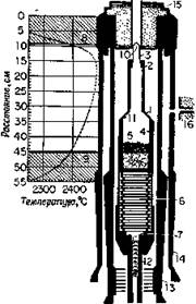 Нагреватель печи состоит из двух коаксиальных тонкостенных графитовых цилиндров 13 и 14, в верхней части соединенных вместе. Участок нагревателя, отвечающий зоне высокой температуры (рабочая часть), имеет диаметр 14, 5 см и длину 40 см (внутренний цилиндр). Толщина стенок Рис. 1. Сублимационная нагревателя в этой области равна 1, 5 см. Наружный камера и нагреватель цилиндр нагревательного элемента окружен слоем теплоизоляции толщиной 15 см; в качестве теплоизолирующего материала используется сажа. Сажей заполнена и заглушка 15, которая служит для регулировки градиента температуры в тигле. Справа от средней части рабочей зоны показан «горячий» конец смотрового канала 16 (диаметр 6 мм, длина 45 см) для контроля температуры нагревателя. Печь нагревается до 2400° С за 16 час, снижение тока до нуля после окончания опыта производится в течение 6 час. Длина сублимационной бутылки, ее положение в печи и ток, проходящий через нагреватель печи, подбираются таким образом, чтобы плоскости, соответствующие изотермам 2390° С, располагались на уровнях 8 и 9. В зоне между изотермами 8 и 9 (незаштрихованная часть температурного графика в левой части фигуры) температура выше 2390° С. В зонах выше изотермы 8 и ниже уровня 9 (заштрихованы) температура ниже 2390° С. Давление (абсолютное) внутри сублимационной бутылки поддерживается равным 12 мм рт. ст. с помощью аргона. По мере повышения температуры печи аргон внутри стакана-питателя постепенно замещается «бинарным паром», содержащим Si и С в различных соотношениях в зависимости от температуры [2, 4], пока вытеснение аргона не станет полным. Единственными фазами, существующими в зоне между изотермами 8 и 9, являются бинарный пар и графит. Выше изотермы 8 и ниже изотермы 9 устойчивой фазой является, кроме того, твердый карбид кремния. Если сублимационную камеру передвинуть вверх на 1 мм, а положение изотерм 8 и 9 оставить неизменным, в стакане-питателе исчезнет слой карбида кремния толщиной 1 мм (появится графитовый остаток толщиной 1 мм), а в коническом тигле на линии роста 10 выше изотермы 8 осядет слой карбида кремния толщиной 1 мм. Если перемещение производить с очень небольшой постоянной скоростью и если на уровне изотермы 8 имеется достаточно большой температурный градиент, можно надеяться, что осадок карбида кремния будет монокристаллическим. Чтобы определить положение изотерм 8 и 9, одна сторона конического тигля 3 была сфрезерована, а внутрь стакана-питателя на том уровне, где в стенке имеется небольшой уступ, был помещен графитовый диск диаметром 9 см и толщиной 2 мм. Эго позволяет проводить одновременные измерения температуры (через окошечко в верхней части печи) на конце конического тигля и на диске внутри стакана-питателя. Отношение внутреннего диаметра стакана-питателя к внутреннему диаметру тигля 3 должно быть достаточно большим по следующим причинам: а) карбид кремния в тигле 3 представляет собой плотный кристаллический осадок, а в питателе — рыхлые куски; б) большая часть карбида кремния, испаряющегося в зоне изотермы 9 в питателе, будет осаждаться обратно ниже уровня 9, что будет приводить лишь к уплотнению загрузки 5, а не к росту осадка 10; в) часть паров теряется через зазор 11 между стаканом-питателем и сублимационной бутылкой, уходит в область радиационных экранов. Радиационные экраны, помимо своего прямого назнач