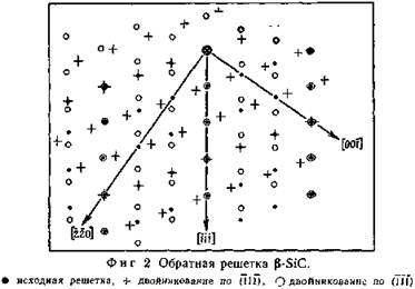 Дифракционные картины, ортогональные оси <220>, лежащей в плоскости (-1-1-1), имели вид, показанный (в форме проекции обратной решетки) на фиг. 2. Подобная картина получается при наличии двойникования по плоскостям {111}. Лишние пятна располагаются в позициях, отстоящих на одну треть и две трети расстояния между основными пятнами. Это указывает на то, что двойникование имеет место как по плоскостям, параллельным главной габитусной грани подложки (-1-1-1), так и по плоскостям (-11-1), наклонным к этой грани (двойники второго порядка). Поскольку электронно-дифракционное исследование поверхности эпитаксиальных пленок показывает, что в осадках с матовой поверхностью имеет место двойникование первого порядка (параллельно главной габитусной плоскости (-1-1-1) подложки и осаждаемого слоя) и в несколько меньшей степени — второго порядка, звездообразные холмики предположительно отождествлены с этим двойникованием. Однако в нескольких случаях рентгеновское исследование (методом качания) эпитаксиальных пленок, выращенных при 1600° С, показывает наличие следов гексагонального SiC. Шестиконечная форма холмиков на поверхности осадка может быть следствием и гексагональной симметрии α-SiC, и тройной симметрии β-SiC (при октаэдрической ориентации кристалла). В обоих случаях холмики имеют ориентацию относительно подложки, отвечающую эпитаксиальному росту. Эти холмики, по-видимому, зарождаются во время роста пленки, а не на поверхности раздела подложка — осадок, так как при оптимальных условиях роста холмики обычно появляются лишь после долгого периода роста гладкой пленки. ЗаключениеВообще говоря, никогда нельзя заранее знать, какой политип получится. Даже при казалось бы абсолютно одинаковых условиях многократно повторяющегося опыта, иногда получаются разные политипы SiC. Список использованной литературы: · "Карбид кремния", под ред. Г.Хениша, издательство "Мир", Москва 1972 · "Карбид кремния", под ред. И.Н.Францевича, Киев 1966 · Курс лекций "Материалы и компоненты электронной техники" В.А.Зыкова СодержаниеОсновные моменты и явление политипизма………………………………………………………1 Политипизм в SiC…………………………………………………………………………………...1 Выращивание кристаллов SiC из пара методом Бриджмена-Стокбаргера……………………...2 Эпитаксиальный рост кубического SiC……………………………………………………………6 Заключение…………………………………………………………………………………………10 Список использованной литературы……………………………………………………………..10 |