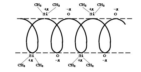 В зависимости от относительной молекулярной массы полисилоксаны представляют собой подвижные или вязкие жидкости или эластичные твердые вещества. Высокая прочность связи -Si-O- делает ее устойчивой к воздействию теплоты и окислителей. Большая разница в электроотрицательности кремния и углерода придает подвижность –органическим радикалам и определяет повышенную гибкость полисилоксановых цепей. Вследствие этого полисилоксановые цепи имеют спиральное строение, при котором компенсируется полярность связи -Si-O-, а сами цепи оказываются окруженными нейтральными углеводородными радикалами (рис.1). Подобное строение полисилоксановых полимеров объясняет их специфические свойства: термостабильность, хорошие диэлектрические свойства, незначительные силы межмолекулярного сцепления, резко отличающие их от углеродных полимеров.