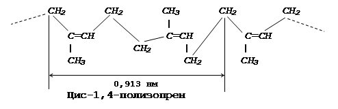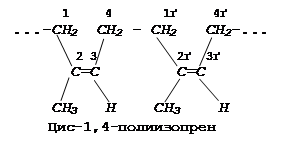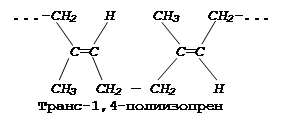 Сопряженные диеновые углеводороды при ионной полимеризации в зависимости от характера катализатора образуют различно построенные полимерные цепи. Различают два типа цепеобразования: цис-1,4, транс-1,4 и цис-1,2. Полимеризация изопрена в присутствии триалкилалюминия и хлорида титана (IV) приводит у цис-1,4-полимеру, в котором цис-построеные остатки диена связаны друг с другом в положении 1,4: