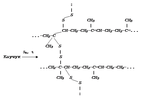 Такое строение доказывается тем, что при окислении этого вида синтетического каучука образуется янтарная кислота, формула которой СООН-СН2-СН2-СООН. Места разрыва углеродной цепи показаны на схеме пунктиром. Хлоропреновый каучук благодаря своей негорючести, термостойкости, светостойкости, а также устойчивости к воздействию масел находит широкое применение в производстве резино-технических изделий. Каучуки на основе кремнийорганических соединений отличаются сохранением эластических свойств как при низких, так и при высоких температурах; каучуки на основе фторорганических соединений сочетают высокую термостойкость с почти абсолютной химической устойчивостью; каучуки, полученные сополимеризацией дивинила с акрилонитрилом, хорошо выдерживают действие бензина и других нефтепродуктов. [3] Натуральный и синтетический каучуки не могут быть непосредственно использованы для химических целей вследствие термической нестойкости, непрочности к стиранию и способности к набуханию и растворению в органических растворителях. Важнейшим процессом превращения каучука в технический продукт – резину – является вулканизация, в результате которой происходит резкое изменение физико-механических свойств каучуков: повышается термостойкость, механическая прочность, устойчивость к действию растворителей и т.д. В 1939 году два американца Гудвир и Хейвардс после многолетних и упорных опытов обнаружили, что при обработке сырого каучука серой происходит его вулканизация. После такой обработки каучук теряет вязкость, становится гораздо эластичнее и сохраняет эту эластичность в широком температурном интервале. Сущность вулканизации заключается в образовании новых поперечных связей между полимерными цепями. При вулканизации серой мостики образуют дисульфидные группы, а при радикальной вулканизации появляются поперечные связи между полимерными цепями: