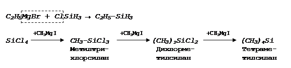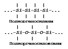 Термин «органо» означает, что кремний в полимерной цепи свободными валентностями связан с органическими остатками. Наибольшее практическое применение получили силоксановые высокомолекулярные соединения. Помимо строения полимерной цепи, кремнийорганические полимеры отличаются остатками, связанными с атомами кремния, образующими полимерную цепь. Обычно это алкильные (арильные) радикалы, реже алкоксильные группы. Кремневодороды – силаны – очень неустойчивые соединения, самовозгорающиеся на воздухе. Первые члены ряда силанов – газы или легкокипящие жидкости: силан SiH4 (температура кипения –1120С), дисилан Si2H6 (температура кипения –150С), трисилан Si3H8 (температура кипения +530С). Так же мало устойчивы и очень реакционноспособны хлорпроизводные силанов: хлорсилан SiH3Cl, трихлорсилан SiHCl3 (силанохлороформ), четыреххлористый кремний SiCl4. Все эти вещества энергично гидролизуются с водой. Так, с цинк- и магнийорганическими соединениями они дают кремнийорганические соединения – алкилсиланы: