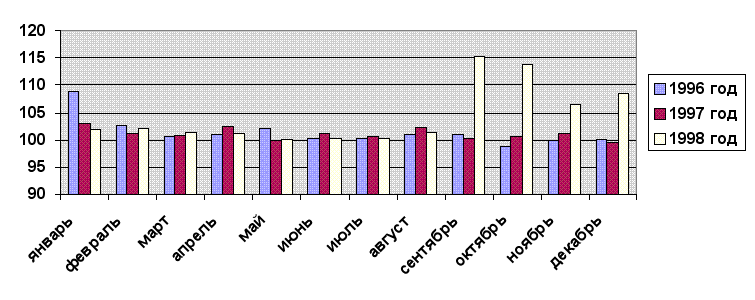 Изменение индекса цен на товары и услуги по Ханты-Мансийскому Автономному Округу в январе - декабре 1996-1998г.г. (в % к предыдущему месяцу)