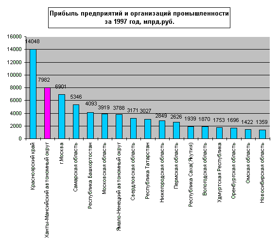 Действенность этих мер уже видна по результатам 1998 г.: произведено деловой древесины 1,5 млн. куб. метров, что составляет 101,9% к уровню 1997 г., пиломатериалов 441 тыс. куб. метров или 107%, столярных изделий – 120 тыс. куб. метров или 115%, значительно возросло производство мебели. В стоимостном выражении объем производства достиг 623 млн. руб., что составляет 110% к 1997 г. Некоторое оживление наметилось в пищевой и легкой промышленности, сфере платных услуг, прежде всего за счет создания и укрепления предприятий малого бизнеса производственной ориентации. Финансовый кризис не мог не сказаться на инвестиционном комплексе округа. Если в 1997 г. в целом объем капитальных вложений вырос на 4% по сравнению с 1996 г., а в социальной сфере соответственно на 8%, то в 1998 г. объем капитальных вложений за счет всех источников финансирования составил (в сопоставимых ценах) всего 78,5% от объемов 1997 г. Цены в строительстве за последний год возросли на 98,6%, т.е. примерно в 2 раза. По прогнозу в 1998 г. на реализацию федеральных программ предусматривалось финансирование за счет средств федерального бюджета в объеме 53 млн. руб. Фактически профинансировано из федерального бюджета в 1998 году 2,5 млн. руб. Задолженность федерального бюджета перед округом составила 50,5 млн. руб. Если традиционно высокий потенциал автономного округа в прошлые годы сочетался с высоким уровнем риска, то благодаря проделанной большой работе в округе по формированию правовых основ поддержки инвестиционной деятельности, продуманной политике инвестирования бюджетных средств в наиболее динамичные отрасли экономики (разведка и разработка новых месторождений полезных ископаемых), развитию благоприятных условий по созданию и выживанию предприятий малого и среднего бизнеса производственной ориентации, позволили существенно снизить уровень инвестиционного риска, снизив его на 34 пункта, и позволил подняться автономному округу в списке регионов с наибольшим снижением риска с 49 на 2 место. Регион сохраняет устойчивое 2-ое место после Москвы по обеспеченности регионального бюджета собственными доходами. Занимает 11-ое место из 20 регионов с наименьшим спадом физического объема производства. В 1997-1998 гг. автономный округ сохраняет лидирующее (2 место) после Москвы по объему капитальных вложений, в том числе по объему прямых и портфельных инвестиций, прежде всего в предприятия нефтегазодобывающей отрасли. В 1997 г. совокупные доходы, формируемые на территории округа составили 103,9 млрд. деноминированных рублей. Из которых 65,6% (т.е. 68,2 млрд. руб.) оставались в распоряжении региона. При этом расходная часть по исполнению составила 68,8 млрд. руб. Именно этот уровень расходов обеспечил формирование положительных тенденций развития производства и социальной сферы. Прибыль предприятий и организаций промышленности ХМАО по сравнению с другими субъектами федерации за 1997 год представлена в приложении 16. По сравнению с 1997 г. доходы населения снизились на 2,5 млрд. руб. (в т.ч. 1,8 млрд. руб. за счет снижения фонда оплаты труда). При этом объем социальных выплат (пенсии, пособия, стипендии) удалось сохранить на уровне 1997 г. даже с небольшим превышением (5,5%), что, конечно, не перекрывает реальные потери, связанные со снижением покупательной способности рубля (особенно в IV квартале 1998 г.). Соотношение средней заработной платы, средн